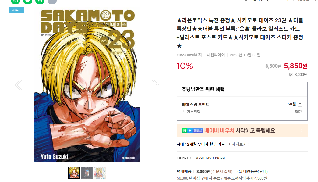링크주소 : ★라온코믹스 특전 증정★ 사카모토 데이즈 23권 ★더블 특장판★★더블 특전 부록: '은혼' 콜라보 일러스트 카드+일러스트 포스트 카드★★사카모토 데이즈 스티커 증정★ : 라온코믹스